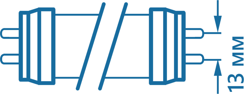 G13 — штырьковый цоколь. Расстояние между штырьками составляет 13 мм. Лампы с данным цоколем устанавливаются в светильники типа Армстронг, ЛПО, ЛВО, ЛСП и прочих. |
