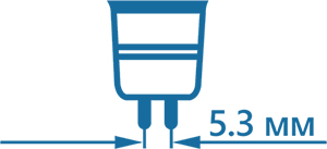 GU5.3 — штырьковый цоколь. Расстояние между центрами штырьков (контактов) 5.3 мм. Лампы с таким типом цоколя чаще всего применяют в освещении квартир и домов, встраивая их в потолок.