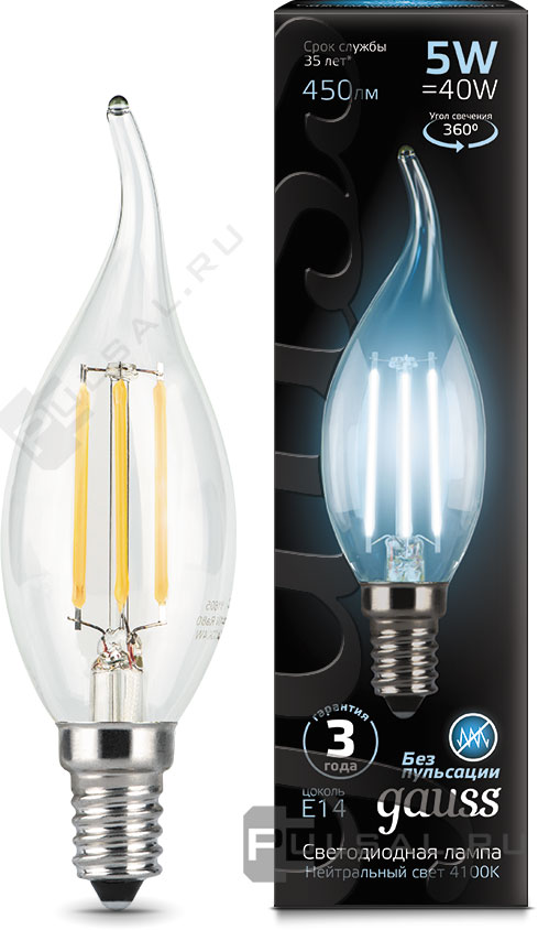 Лампа прозрачная филаментная Black, цоколь - E14, мощность - 5Вт, световой поток - 450Лм, цветовая температура - 4100К, не диммируется, 104801205, Gauss