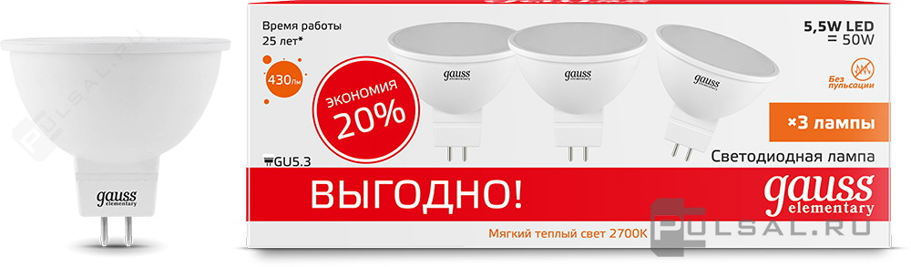 Elementary, цоколь - GU5.3, мощность - 5.5Вт, световой поток - 430Лм, цветовая температура - 3000К, не диммируется, 13516, Gauss