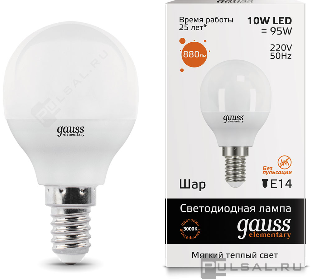Лампа светодиодная Elementary, цоколь - E14, мощность - 10Вт, световой поток - 880Лм, цветовая температура - 3000К, не диммируется, 53110, Gauss