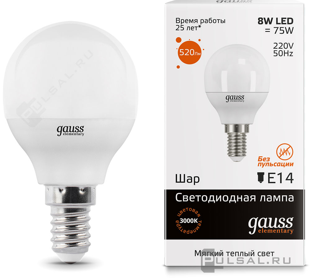 Elementary, цоколь - E14, мощность - 8Вт, световой поток - 520Лм, цветовая температура - 3000К, не диммируется, 33118, Gauss