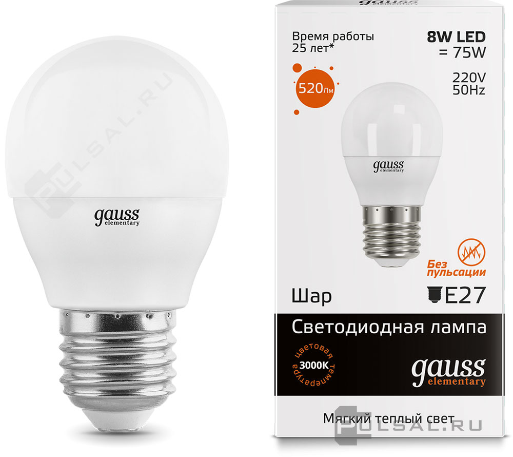 Elementary, цоколь - E27, мощность - 8Вт, световой поток - 520Лм, цветовая температура - 3000К, не диммируется, 33218, Gauss