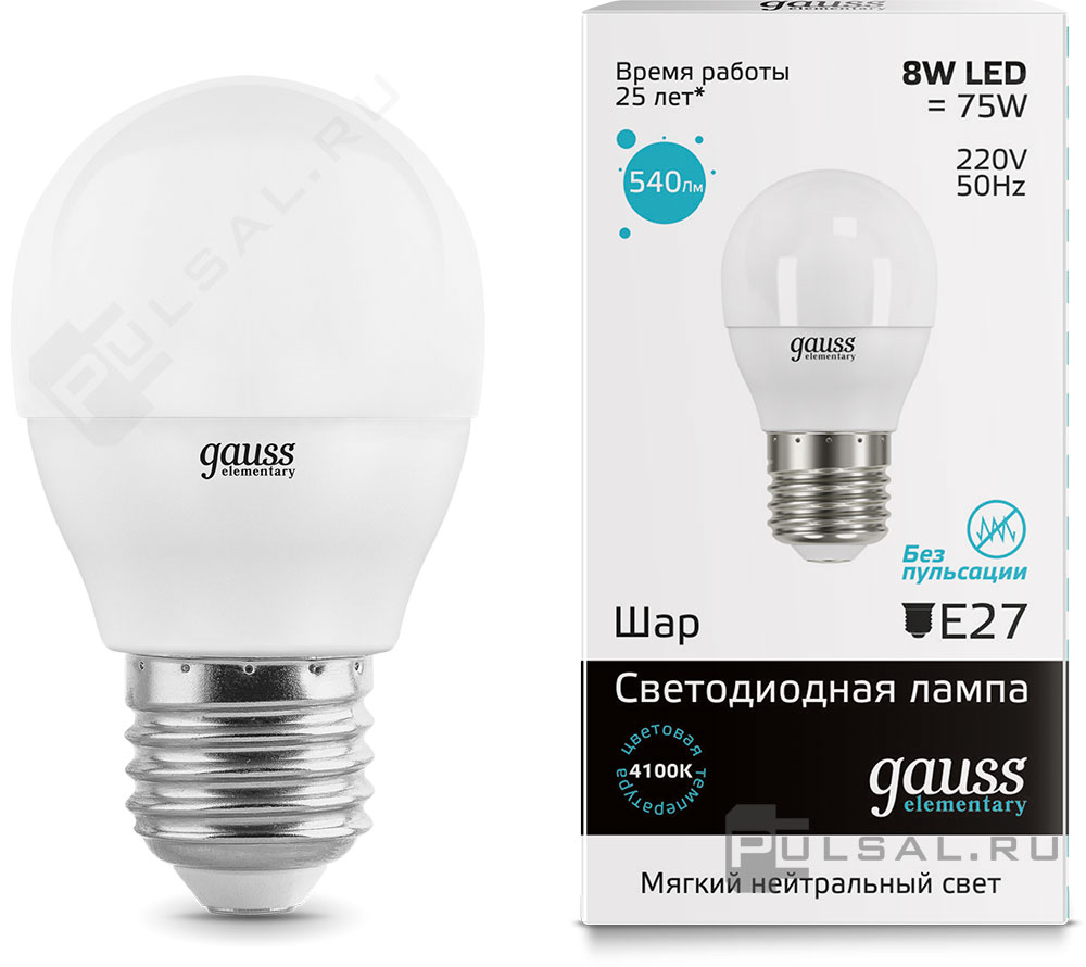 Лампа светодиодная Elementary, цоколь - E27, мощность - 8Вт, световой поток - 540Лм, цветовая температура - 4100К, не диммируется, 53228, Gauss