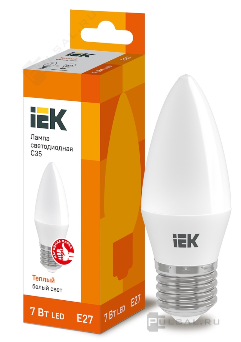 Лампа светодиодная Лампы IEK, цоколь - E27, мощность - 7Вт, световой поток - 630Лм, цветовая температура - 3000К, не диммируется, LLE-C35-7-230-30-E27, IEK