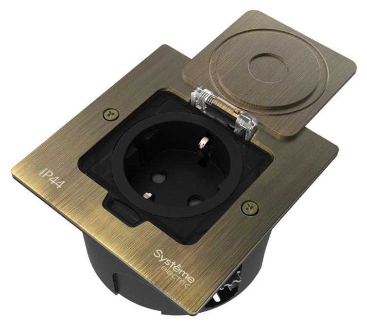 Лючок MultiDesk с розеткой и монтажной коробкой для стены, фальшпола, стола MultiDesk, W45, напольная, для сплошных стен, для столов и мебели, для полых стен и гипрока, 1 пост, цвет - латунь античная
