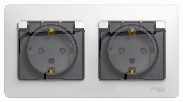 Розетка моноблок в две монтажные коробки Glossa, со шторками, с крышкой, с заземлением, двойная, винтовые клеммы, цвет - белый