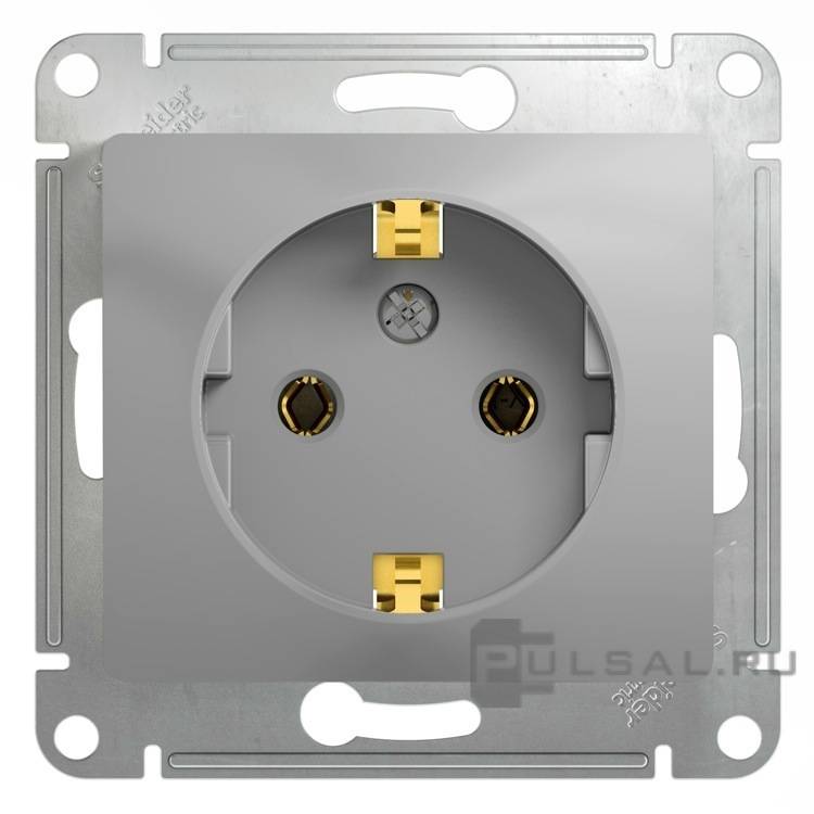 Розетка Glossa, без шторок, с заземлением, одинарная, винтовые клеммы, цвет - алюминий