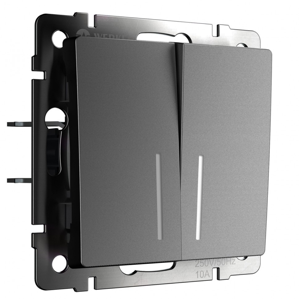 Выключатель Alumax, Split, Slab, Senso, Baguette, Acrylic, Platinum, Elite, Snabb, Stream, Flock, Stark, Fiore, Favorit, Diamant, Aluminium, Antik, Metallic, двухклавишный, с подсветкой, цвет - графит матовый