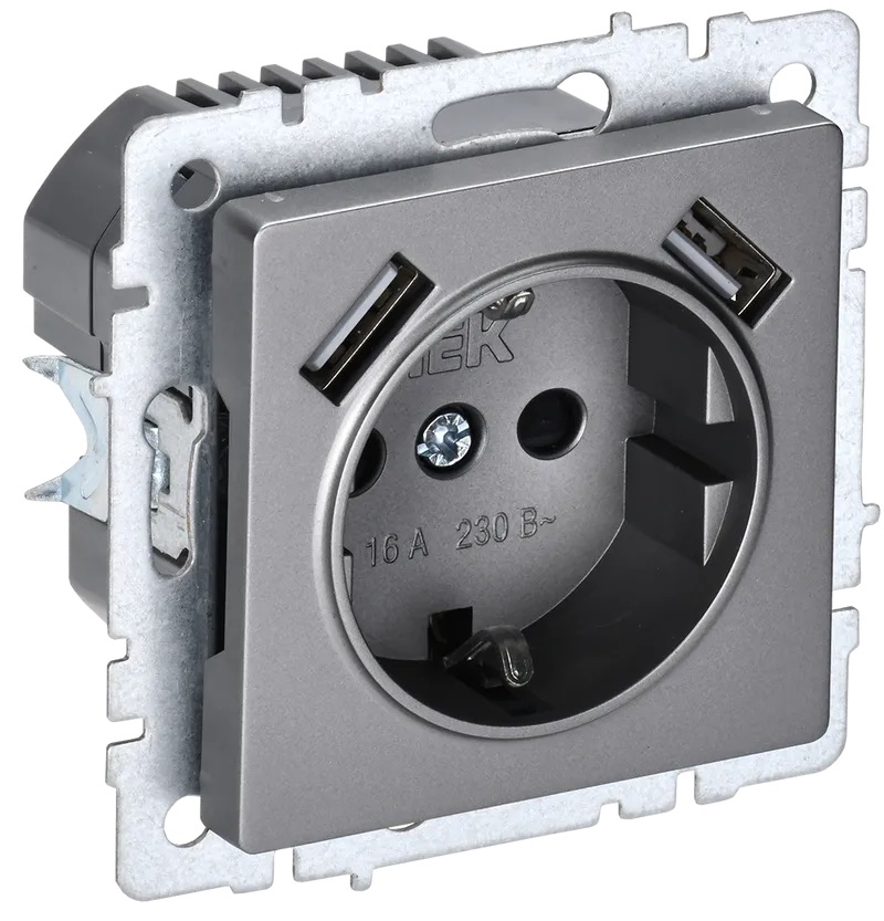 Розетка электрическая + USB А+А, 3,1 А BRITE, USB type-A 5V, двойная, цвет - сталь